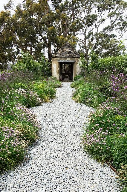 This serene white pebble path brightens up the garden and draws your eye toward the cozy shed at the end. The soft crunch underfoot makes every step feel like a peaceful walk through nature.