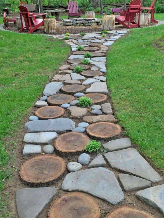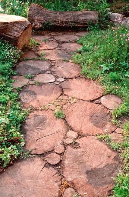 To make one yourself, slice logs into thick rounds, then dig shallow spots to nestle each slice flush with the ground. Fill the gaps with soil or creeping ground covers like moss or thyme for a soft, organic look.