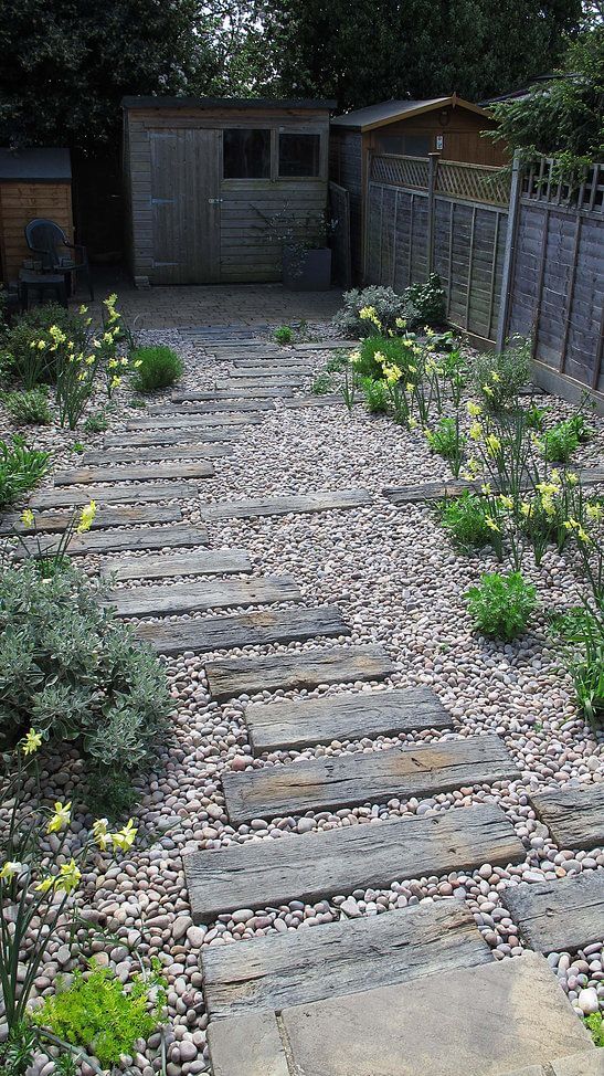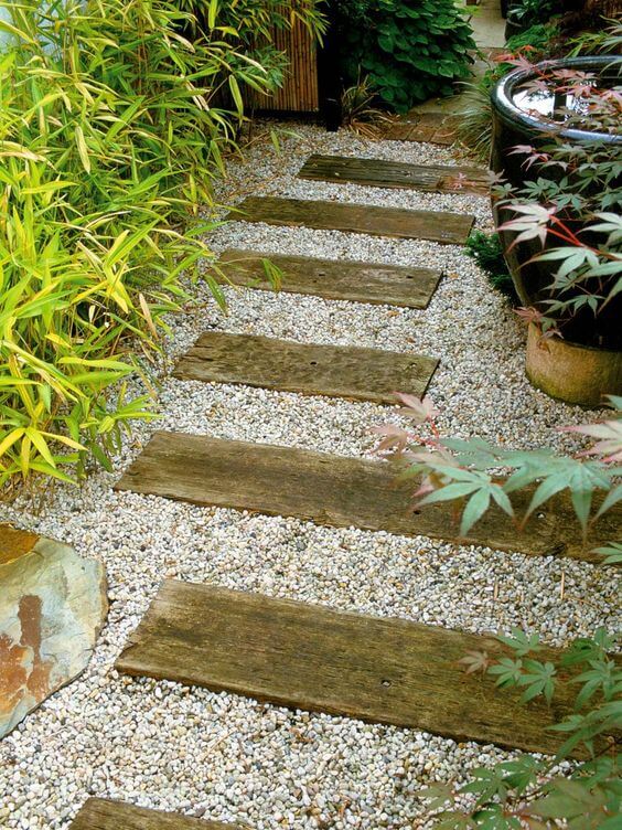 Just lay the wood boards in a staggered pattern, then fill the spaces with pebbles to lock them in place. You’ll want to level the ground first and use a weed barrier underneath to keep it low-maintenance.