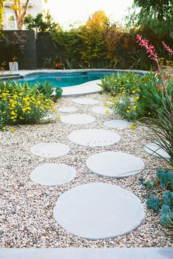 You can pour your own concrete rounds using large plastic trays or molds, then set them evenly in the gravel base. Space them out for a natural walking rhythm.