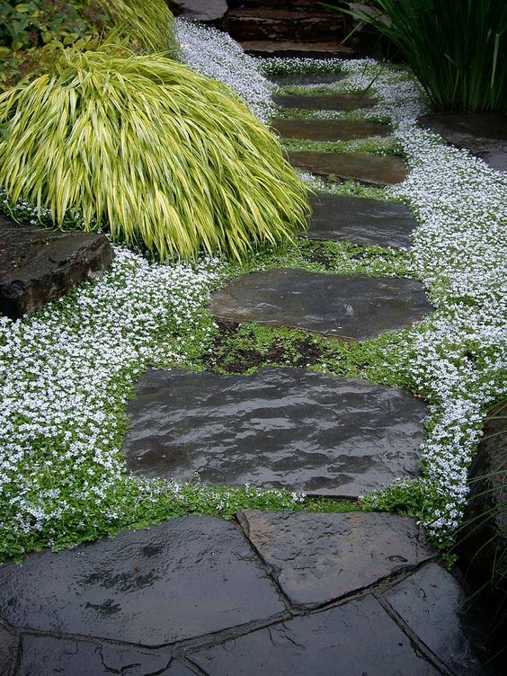 The irregular stone shapes give it a relaxed, natural feel, perfect for Mediterranean or cottage-style gardens. For a similar effect, use creeping thyme, Irish moss, or dichondra as a filler between stones.