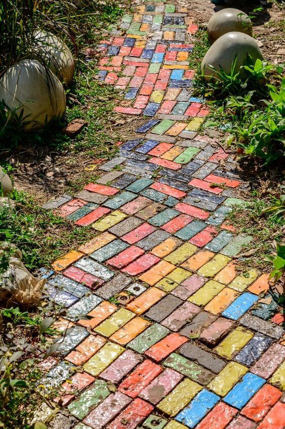 To make your own, clean old bricks thoroughly, coat them with outdoor acrylic paint, and seal them to protect against the elements. Arrange them in a pattern that feels fun to you.