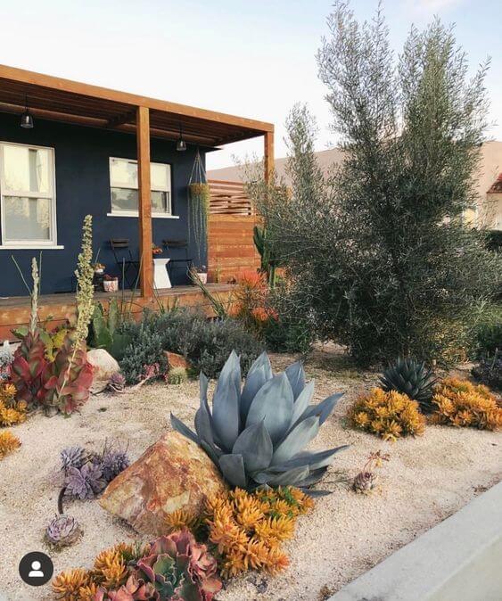 Combining agaves with cactus among rocks makes the yard bold and structured. Use large stones as the base and plant around them.