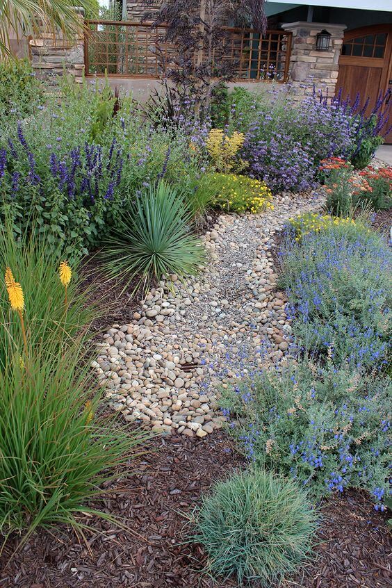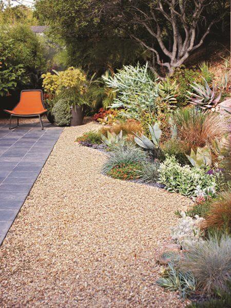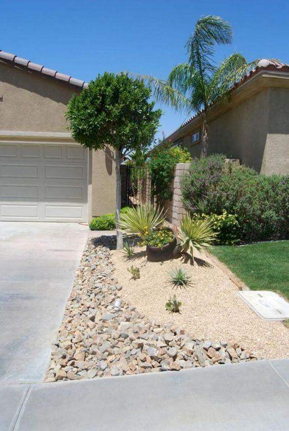 Add small pathways of gravel so you can walk through and enjoy the view. Use pots for some plants to make the layout flexible. Add solar lights to make it glow at night. This idea makes the front yard look like a small desert oasis.