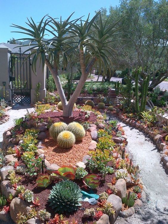 Use a mix of heights, such as low-growing rosettes with taller cactus. Refresh the stone layer once a year to keep it neat. This design gives your yard a bright, cheerful look with very little upkeep.
