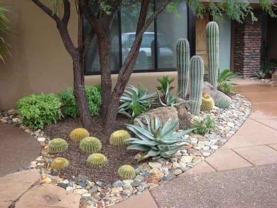 Filling your yard with cactus, succulents, and low shrubs creates a cozy desert scene. Group plants of different shapes together to keep it interesting.