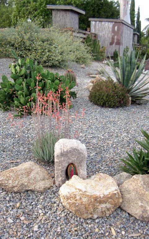 Placing a statue of the Blessed Mother among desert plants creates a serene, spiritual space. Surround the statue with agaves, aloe, and blooming desert flowers.