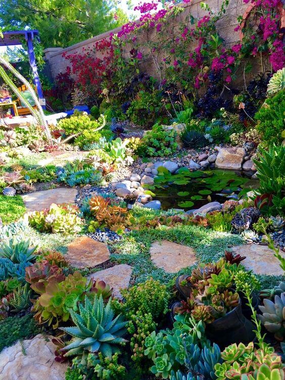 Pairing a pond with a wide variety of succulents creates contrast and beauty. The water reflects the plants and cools the space. Surround the pond with colorful rosettes and tall cacti.