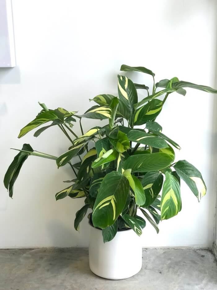 Lubbersiana stands out with oblong leaves marbled in creamy yellow and green, often touched with pale streaks of white. Growing 2–4 feet tall, it works well as a medium-sized houseplant in bright, indirect light.