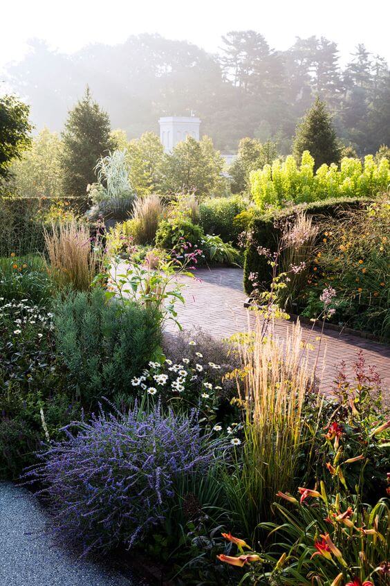 This countryside garden feels peaceful and open, thanks to the sweeping ornamental grasses. The fluffy plumes glow beautifully in the soft evening light, adding a dreamy touch.