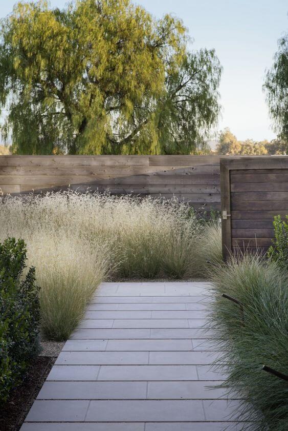 This garden path feels calm and welcoming, framed by soft ornamental grasses that sway in the breeze. The neutral tones and clean lines of the fence and tiles make the grass stand out.