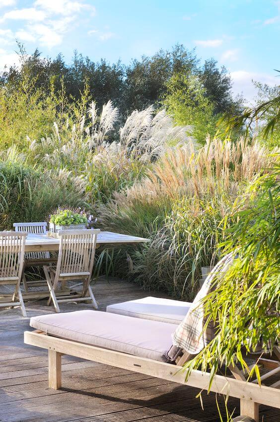 This cozy outdoor nook feels like a secret escape, surrounded by tall ornamental grasses that offer both privacy and softness. The natural textures of the wooden chairs and loungers blend effortlessly with the flowing plumes.
