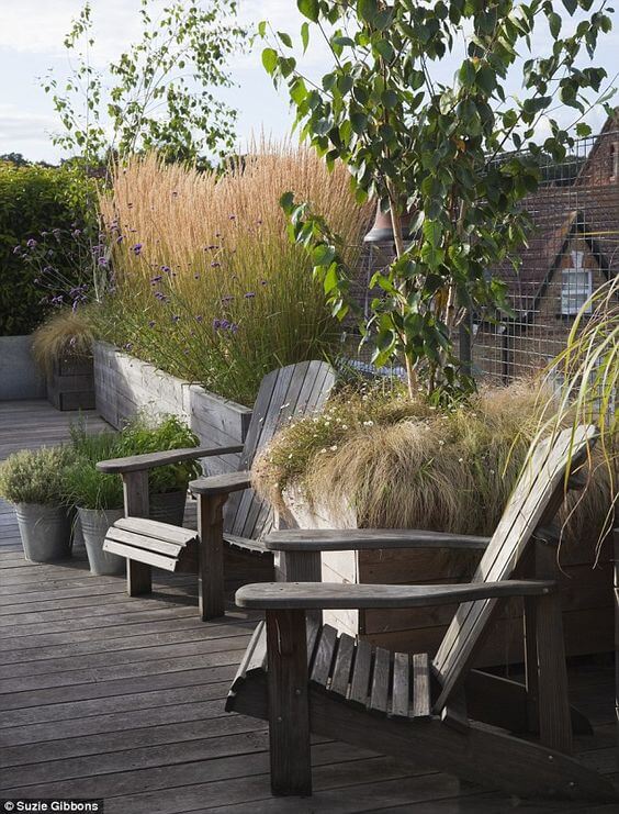 This rooftop garden brings a cozy, rustic charm with its weathered wooden chairs and softly swaying ornamental grasses.