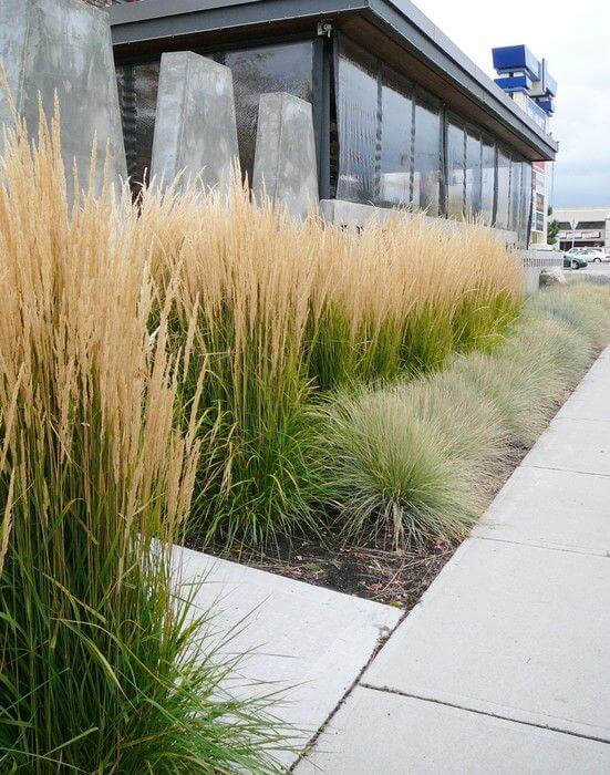 The clean lines of the sidewalk and building contrast nicely with the feathery texture of the grass. It’s a low-maintenance solution that brings beauty and function to commercial or urban areas.