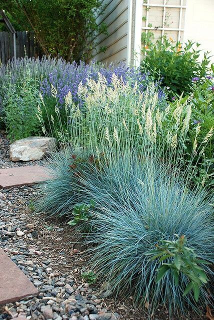 This border planting is a total showstopper. The mix of silvery blue fescue and upright ornamental grass creates texture you can feel with your eyes.