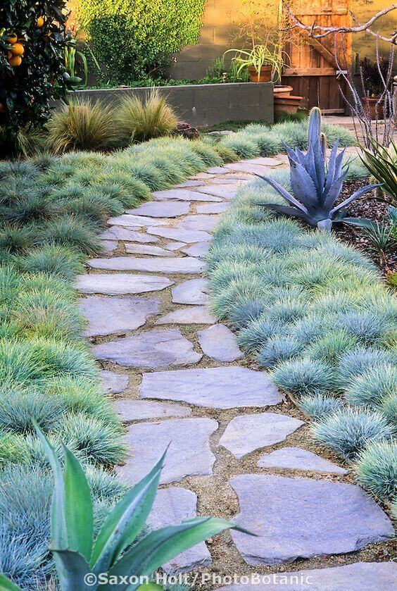 The soft blue fescue grasses lining both sides create a plush, cloud-like border that guides your steps with calm elegance. Between the cool-toned grass and wide stone slabs, everything feels peaceful and balanced.