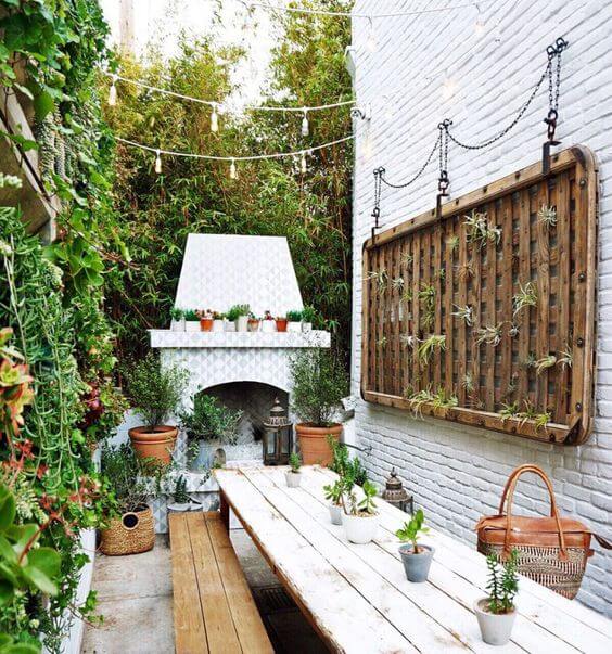 This narrow garden corner blends privacy and charm with its crisp white fireplace and long rustic dining table. Surrounded by lush pots and a wall of green, the space feels like a small escape from the indoors.