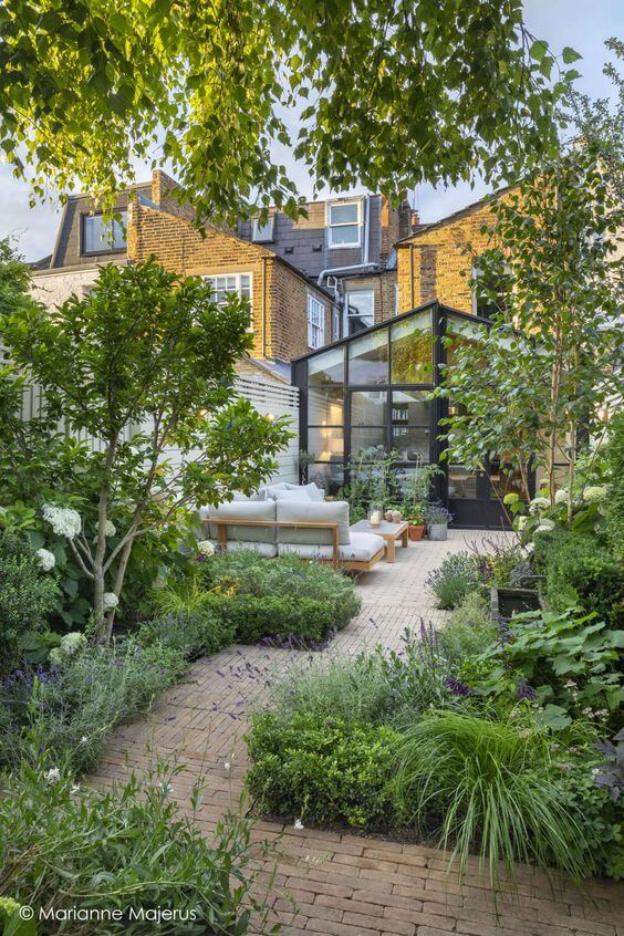 This backyard blends a modern greenhouse structure with a soft, winding brick path and thick greenery.