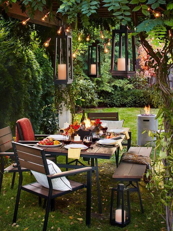 The wooden table is set beneath a vine-covered pergola, with string lights and lanterns casting a soft glow as evening falls. A mix of chairs and benches adds flexibility and comfort, while nearby plants bring privacy and peace.