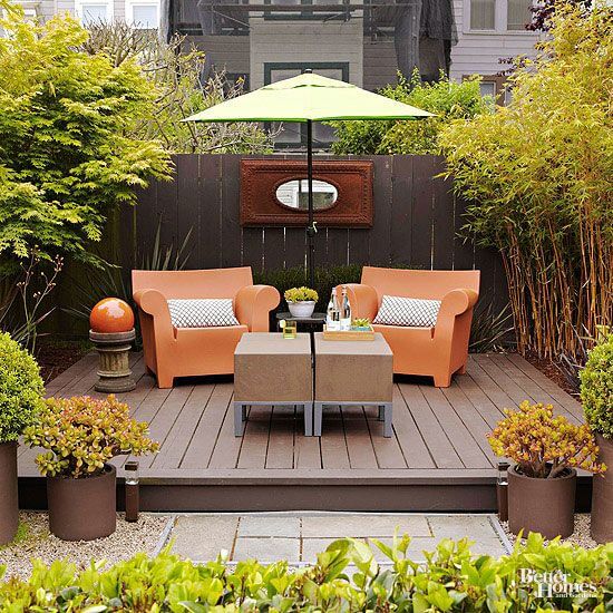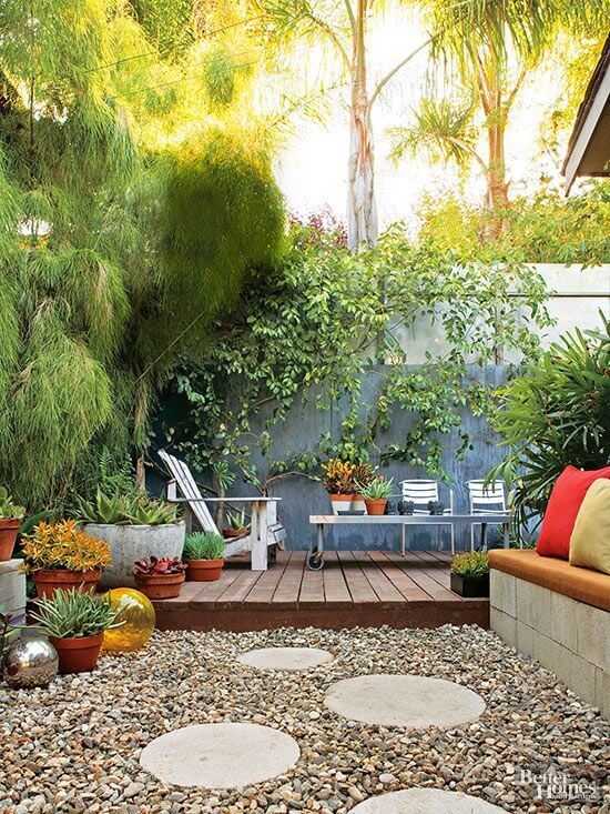 You can easily achieve this look by clustering various-sized pots with large-leafed plants around the deck’s perimeter for instant privacy. To make a similar fire pit, build a simple concrete block structure and ensure the gas line installation is completed safely and professionally.