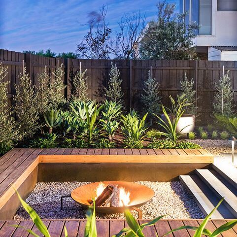 To achieve this look, incorporate hardy, sculptural plants, like the succulents shown, along the edges to soften the hard wooden lines. You should always ensure proper drainage when building a sunken area so water does not pool in the center.