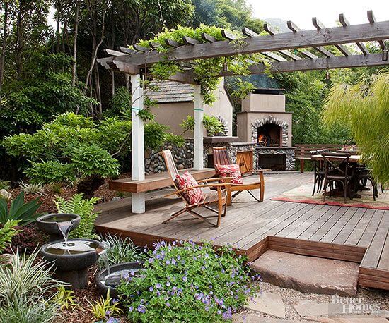A rustic wooden pergola, partially covered with climbing vines, provides much-needed shade over the central deck. The built-in outdoor fireplace and stone oven immediately signal this is a prime spot for both cozy evenings and serious entertaining.