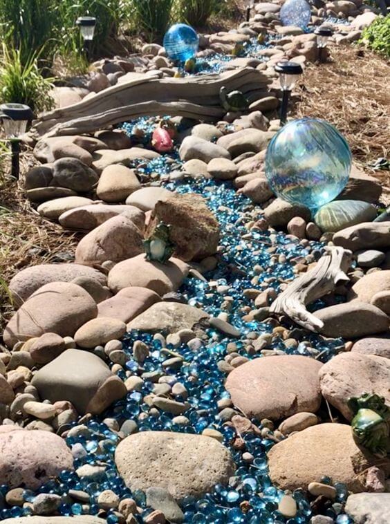 You can mix natural pebbles with decorative accents like driftwood, glass orbs, or small statues for extra charm. Begin by forming a shallow streambed, fill it with a mix of stones, then layer in blue glass gems to form the “water.”