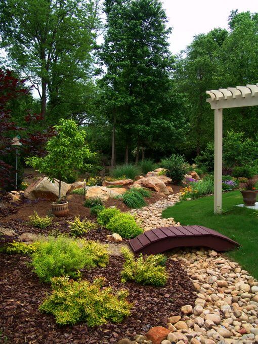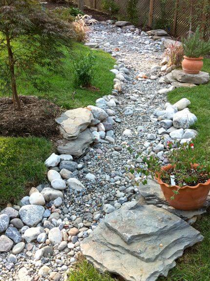 You can use it to direct rainwater or simply as a decorative feature that breaks up greenery beautifully. To make one, dig a shallow trench, line it with landscape fabric, and fill it with river rocks and small boulders.