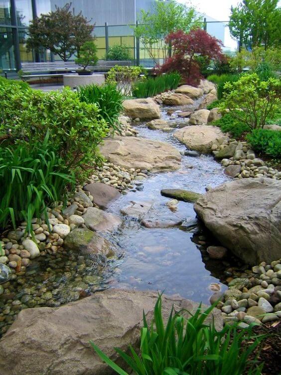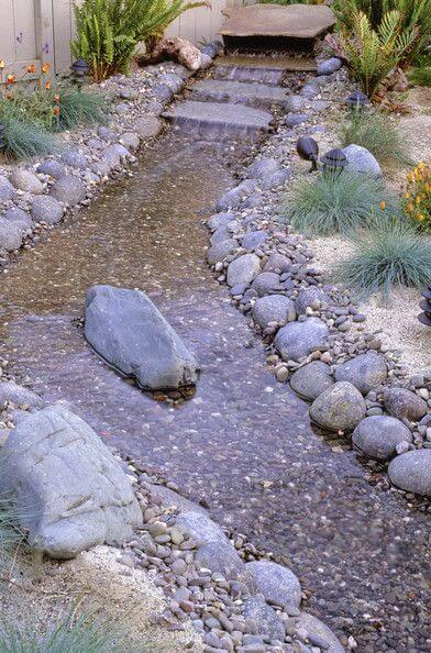 You can design yours by shaping a gentle stream path and using a pond pump to keep the water moving. Place different rock sizes for a natural look and surround them with shrubs or ornamental grasses.