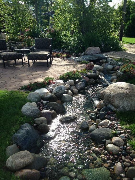 Surround the area with low-growing plants and flowers to soften the rocky edges. Sitting beside this little river, you’ll feel the day’s stress wash away in its soothing rhythm.