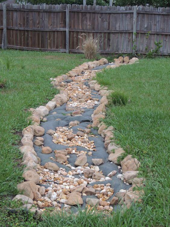 To make it, dig a shallow trench and line it with landscape fabric to stop weeds from growing. Fill the center with mixed river rocks, layering larger stones on the edges for a realistic bank effect.