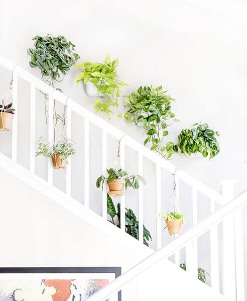 Clean lines meet cascading foliage in this effortlessly stylish staircase garden. Mounted above and strung below the white railing, the hanging planters double the greenery without hogging any walking space.