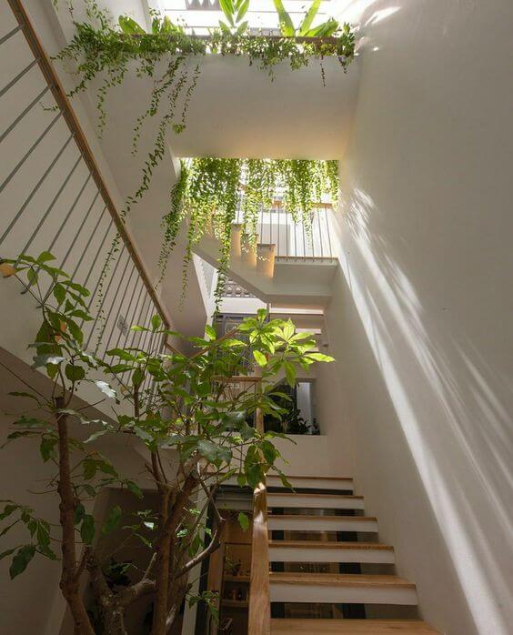 The dark wood steps contrast beautifully with the vibrant foliage, creating a living banister that feels alive with motion. It’s an organic railing that softens the angles of the staircase while connecting both floors with nature.