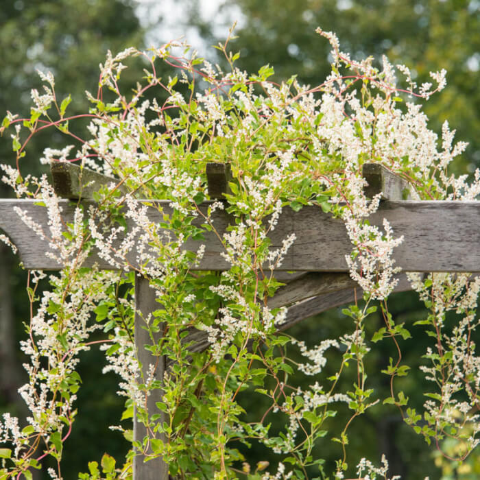 Silver Lace Vine is an energetic grower, with clusters of tiny white flowers that cover the plant like a soft cloud. It can shoot up to 35 feet in zones 4–8 and adapts easily to many soil types.