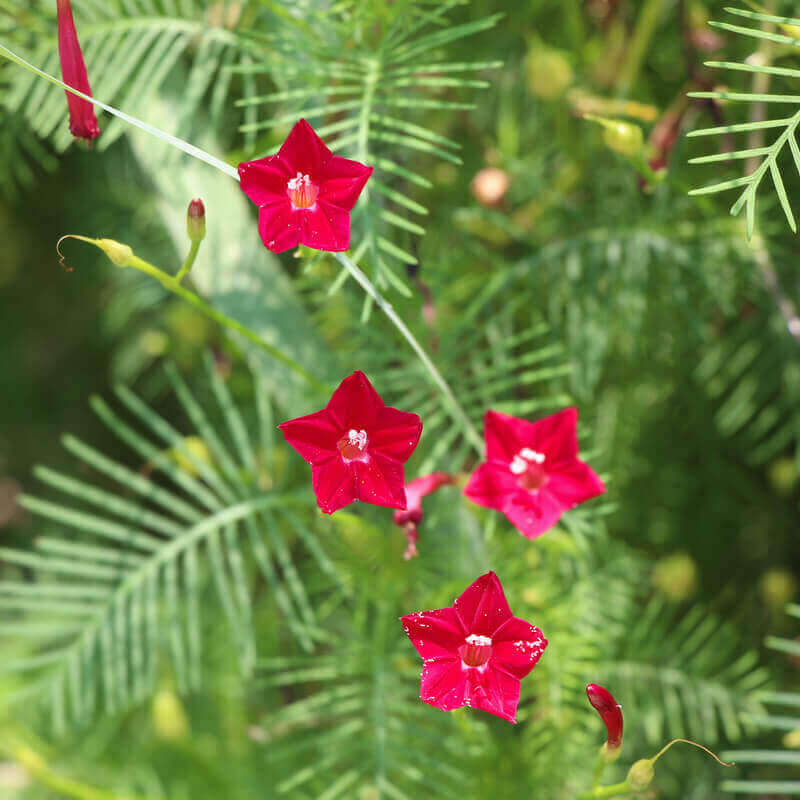 This plant is a cross between the Cypress Vine and the Scarlet Morning Glory. It can withstand some shade but grow happily in full sunlight.