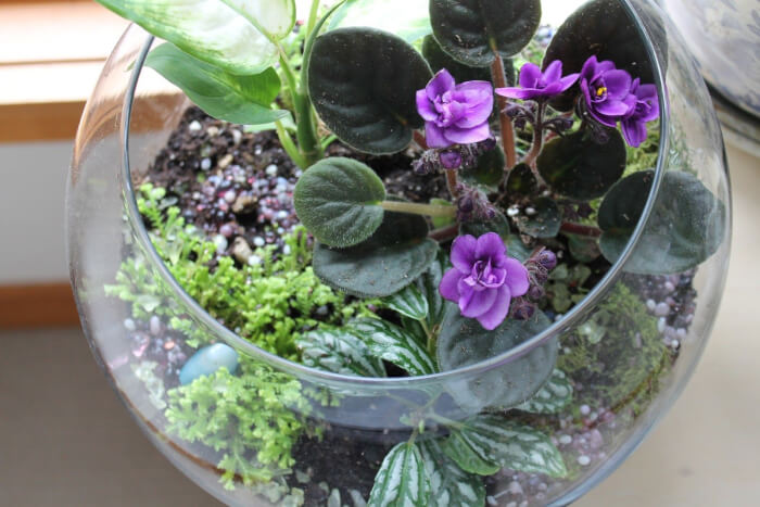 African violets reward you with blooms in shades of purple, pink, or white that brighten up any terrarium. They dislike water on their leaves, so water at the base or use a wick system.