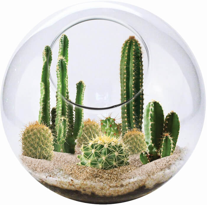 Cacti are perfect for a sunny terrarium with an open top to keep humidity low. Their unique shapes and spines make them stand out as living sculptures.