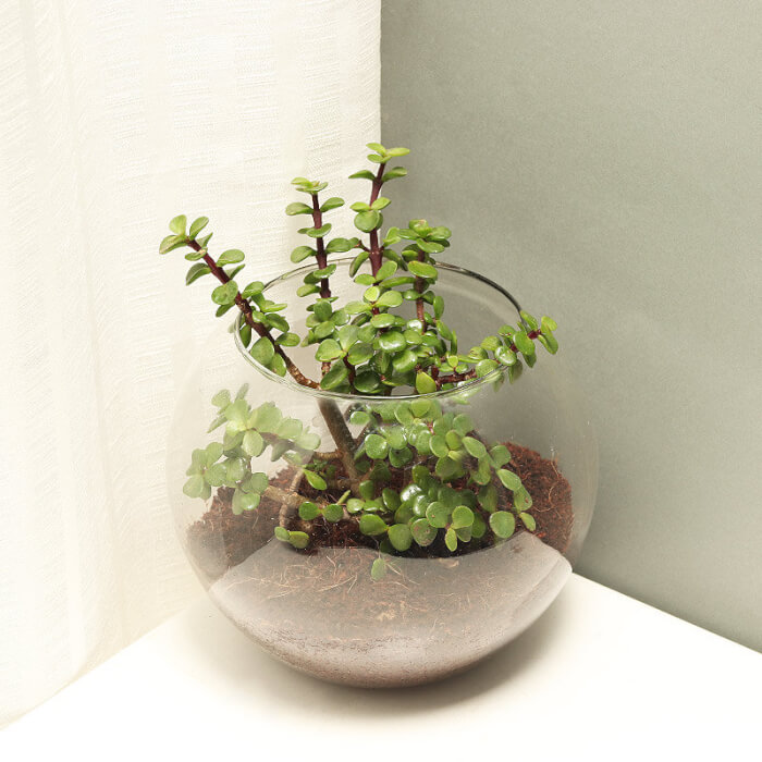 Place it near a bright window to keep the leaves plump and shiny. Over time, it can grow into a miniature tree, giving your terrarium a timeless look.