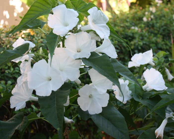 White Morning Glory opens its blooms at night, offering a touch of magic to your evenings. The trumpet-shaped flowers release a soft scent and continue into early fall. Plant them in full sun for abundant flowering.