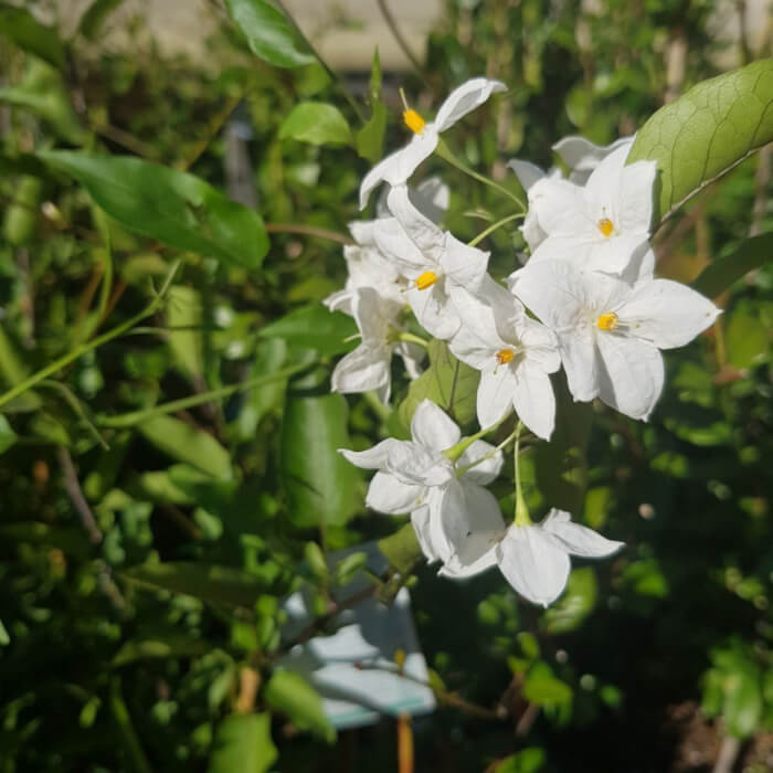 Potato Vine offers star-shaped white flowers that resemble jasmine, though the scent is lighter. It is a low-maintenance climber that grows quickly once established. Give it full sun to partial shade and fertile, well-drained soil.