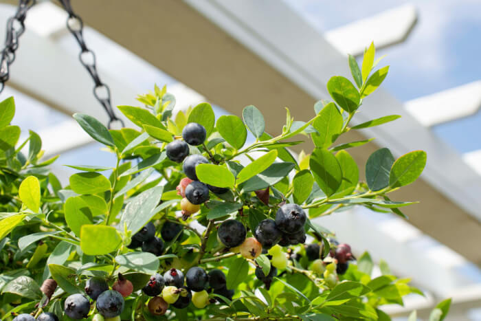 Blueberries bring both ornamental beauty and delicious fruit to your hanging baskets. Their clusters of berries contrast beautifully against their bright green foliage. Choose a dwarf variety and plant in acidic, well-drained soil for best results.