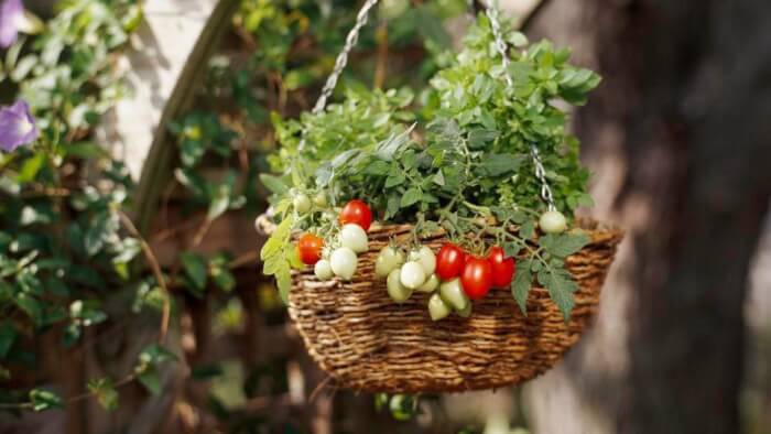 Cherry tomatoes are one of the easiest fruits to grow in hanging baskets. Their trailing vines look attractive while producing clusters of bite-sized tomatoes. You’ll need a sunny spot with at least 6 hours of direct light each day.