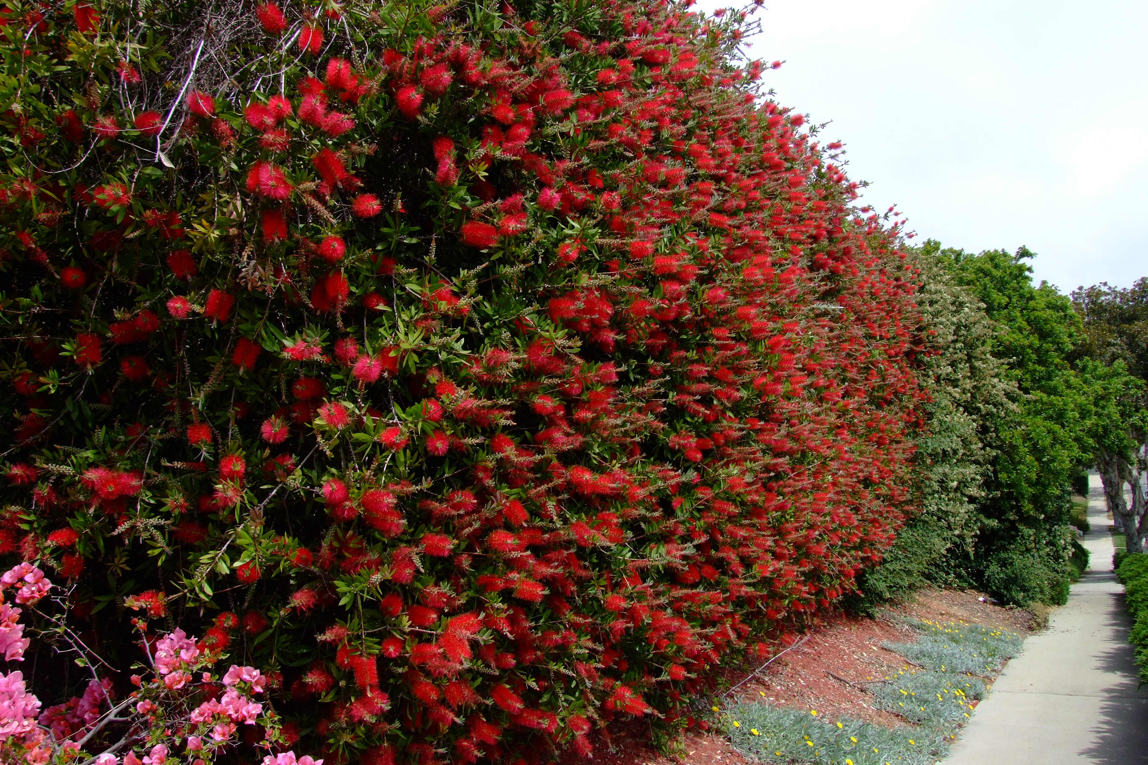Their blooms attract hummingbirds and butterflies, adding life to your garden. Bottlebrush prefers well-drained soil and occasional pruning after flowering. A hedge of these shrubs provides both privacy and bold color.