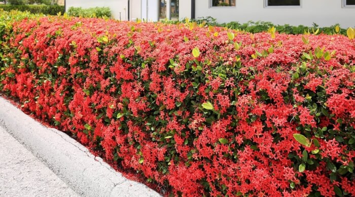 Fertilize every few weeks to promote continuous blooming. Ixora hedges bring a tropical charm with their compact growth and vibrant blossoms. They are ideal for brightening up patios and walkways.