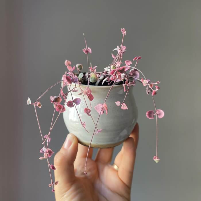 Features: It is a special plant for creative gardeners who want their plants to have more than just the traditional shade of green. Not only is this plant variegated, but it has pink variegation as well! Tiny heart-shaped leaves in shades of pink, white, and green cover this low-maintenance vine. Succulent leaves have pink leaf borders and a greenish-white core.