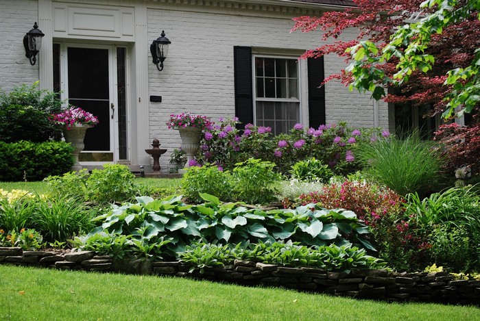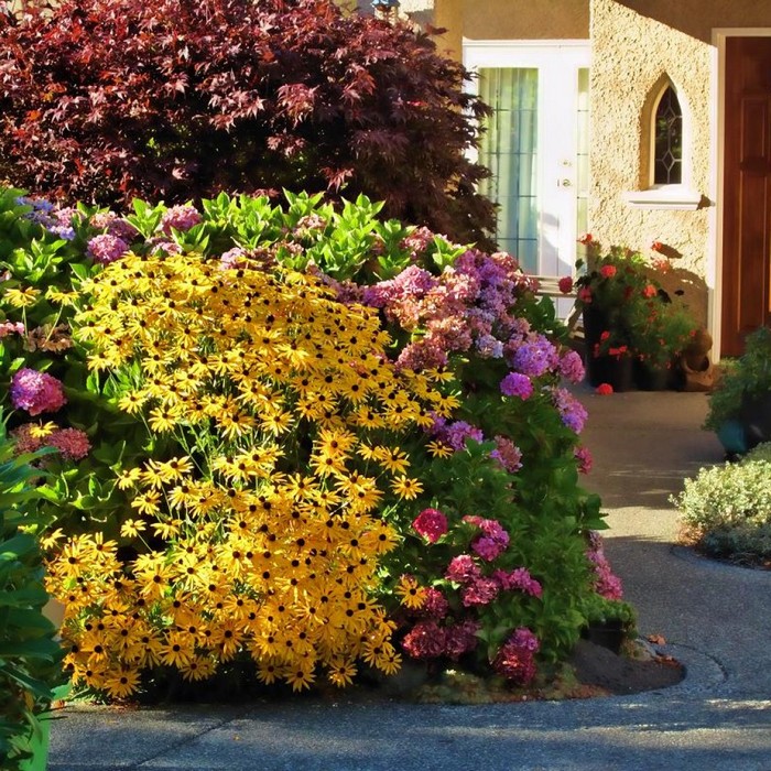 Beaux parterres de fleurs près de la maison