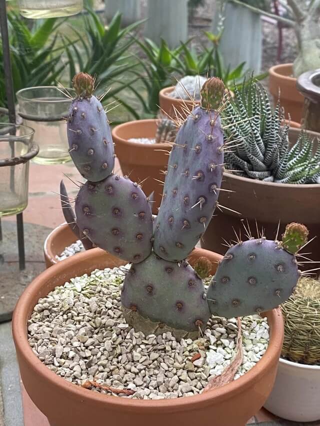 Use well-draining soil to prevent rot and water deeply but infrequently. Its striking pads bring color contrast to any cactus garden. Grow it outdoors where it has room to spread for the best effect.