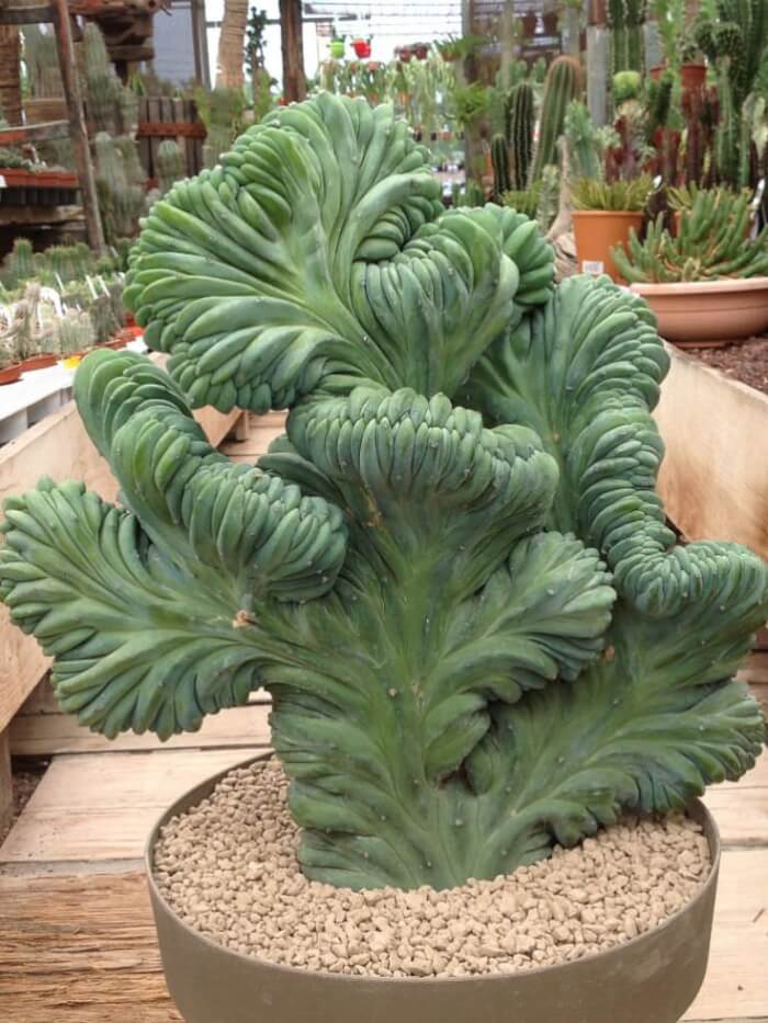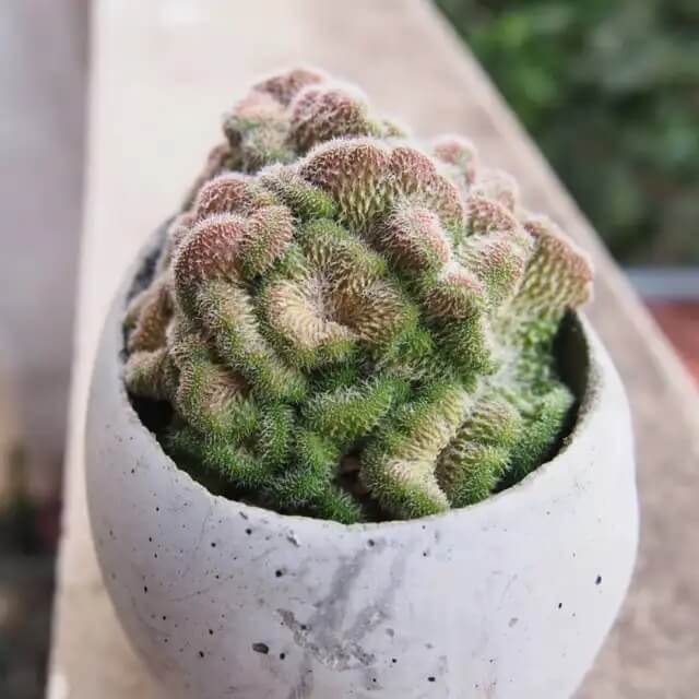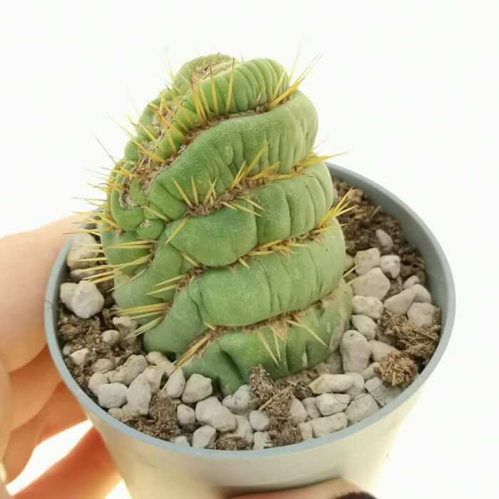 Brain Cactus lives up to its name with twisted stems that mimic the folds of a human brain. Its unusual form develops when the cactus grows in a crest instead of straight upward. It enjoys bright light but can also adapt to indoor conditions.