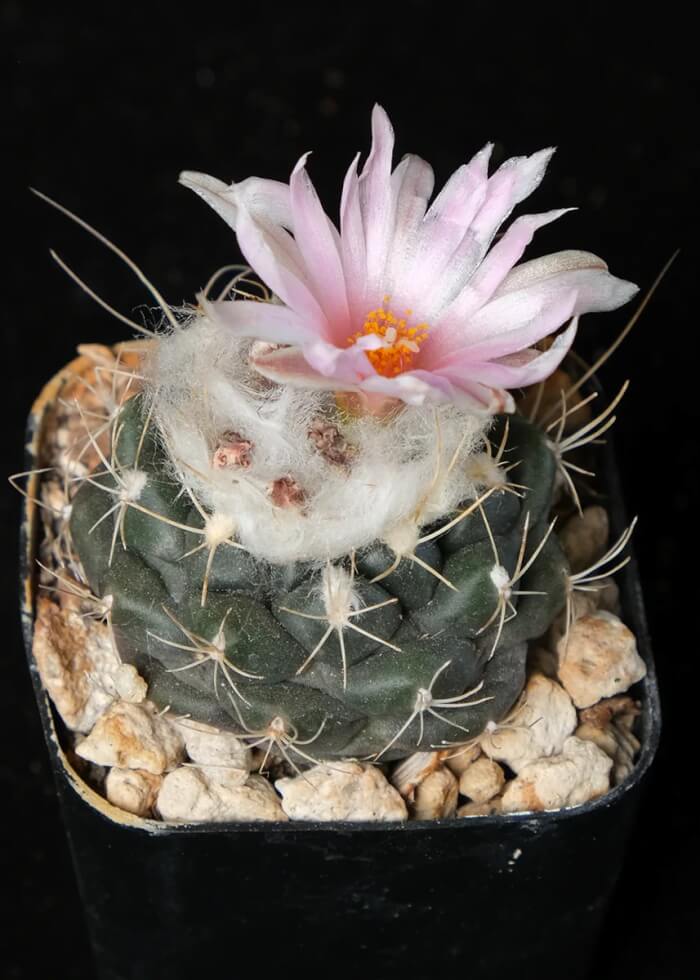 Turbinicarpus Cactus is a rare species found on rocky slopes in Mexico. Its small, knobby growths are topped with delicate flowers in white or pink. It needs gritty soil and full sun to thrive.
