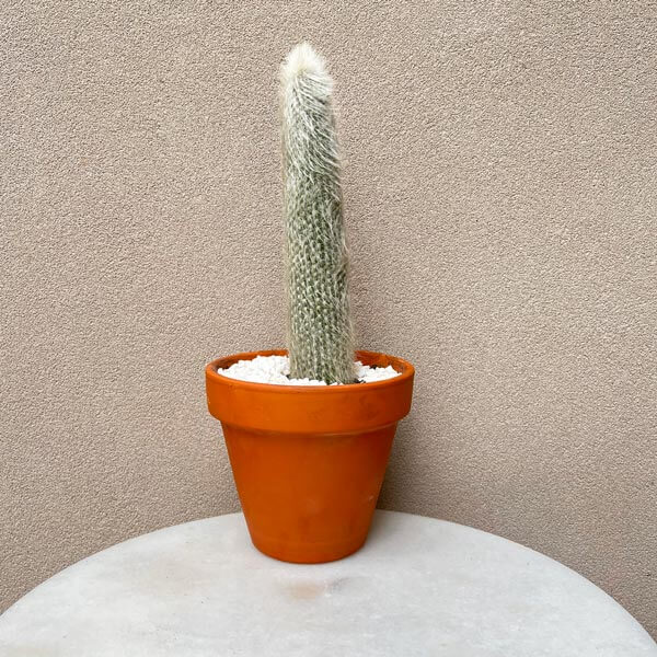 Silver Torch Cactus is tall and slender, covered in fine white hairs that give it a silvery glow. It can grow up to 10 feet tall, making it an impressive sight. In summer, it produces bright red, tubular flowers.